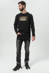 Hanorac negru EA7 EMPORIO ARMANI pentru bărbați cu logo mare auriu. Partea de jos și mânecile sunt finisate cu manșete canelate din elastic neted.