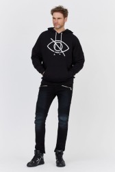 Hanorac pentru bărbați în negru cu glugă. Imprimeu alb pe față și buzunar mare. Logo alb mare pe spate. Glugă cu cordon. Partea de jos și mânecile sunt finisate cu tiv canelat.