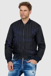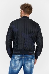 Jachetă bărbătească EMPORIO ARMANI cu două fețe. O parte neagră, matlasată cu un model moro albastru marin. Cealaltă parte gri cu logo mic la piept. Se închide cu un fermoar bidirecțional. Două buzunare pe față. Jachetă finisată cu manșete, gât și talie cu nervuri. Talie cu logo mare în gri.