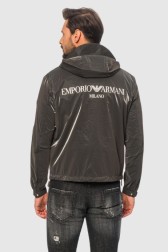 Jachetă bărbătească EMPORIO ARMANI în gri. Logo alb pe spate și fermoar decorativ pe mâneca stângă. Jachetă realizată din țesătură tehnică Extra Shiny Glass ultra-ușoară, impermeabilă și rezistentă la vânt. Fermoar alb. Glugă cu vârf, cordon de strângere cu opritor metalic. Două buzunare cu fermoar pe laterale. În interior, două buzunare cu fermoar și bretele detașabile. Manșete cu nervuri cu presare. Elastic reglabil la talie.