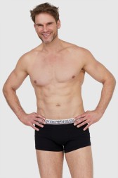 Trei perechi de boxeri din bumbac de culoare neagră. O pereche cu talie elastică albă cu logo negru, a doua cu elastic maro, a treia cu elastic gri.
