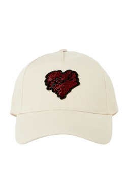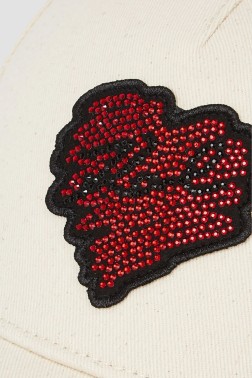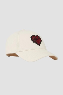 Șapca de baseball din bumbac de culoare crem are un design clasic, cu o față căptușită și un vârf curbat pentru un aspect elegant și o purtare confortabilă. Partea frontală prezintă un plasture în formă de inimă, împodobit cu zirconii cubice roșii și negre, care conferă produsului o notă unică și atrage atenția. Datorită închiderii reglabile de la spate, șapca se adaptează perfect la diferite mărimi ale capului pentru o potrivire confortabilă. Este un accesoriu elegant care va funcționa bine cu stilul de zi cu zi, combinând stilul casual cu o notă de eleganță.
