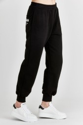 Pantaloni de trening pentru femei în negru. Logo alb la spate deasupra buzunarului. Buzunare glisante pe laterale. Talie elastică cu cordon suplimentar pe interior. Capătul picioarelor cu manșete cu nervuri.