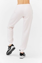 Pantaloni de trening de damă în roz. Logo mic brodat pe piciorul stâng. Două buzunare la partea din față. Talie și picioare elastice cu manșete cu nervuri.