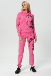 Pantaloni de trening pentru femei în roz cu un imprimeu negru cu ursuleți de pluș pe piciorul stâng. Plus un logo mic al companiei pe șold. Talie și picioare finisate cu ornamente cu nervuri.