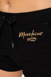Pantaloni scurți din bumbac pentru femei MOSCHINO SWIM de culoare neagră. Aplicație logo aurie pe șoldul stâng. Două buzunare glisante. Talie elastică cu cordon. Picioare finisate cu nervuri.