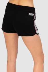 Pantaloni scurți din bumbac pentru femei MOSCHINO UNDERWEAR de culoare neagră. Decorați cu bordură roșie și albă cu logo negru. Două buzunare glisante. Talie elastică cu cordon. Logo mic alb pe spate. Picioare cu bordură cu nervuri.