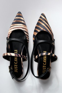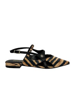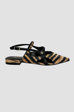 Pantofi eleganți cu toc plat în stil slingback pentru femei. Au un vârf ascuțit și un model izbitor care amintește de dungi de tigru.