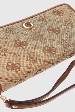 Portofel din stofă bej pentru femei de la Guess. Cu o închidere cu fermoar, are un buzunar pentru monede, două compartimente, 12 sloturi pentru carduri, două buzunare glisante și un buzunar exterior suplimentar cu fermoar.