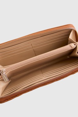 Portofel din piele ecologică maro pentru femei de la Guess. Închidere cu fermoar, buzunar interior cu fermoar pentru monede, două compartimente, 12 sloturi pentru carduri, două buzunare glisante și un buzunar suplimentar cu fermoar în spate.
