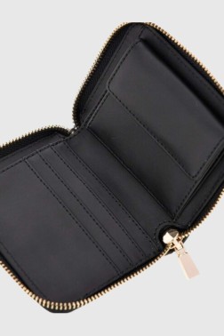 Portofel negru din piele ecologică pentru femei de la Guess. Închidere cu fermoar, în interior un buzunar pentru monede blocabil, un compartiment și 4 sloturi pentru carduri.