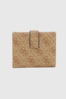 Portofel din piele ecologică bej pentru femei de la Guess. Dispune de o închidere instantanee, un buzunar cu fermoar pentru monede în interior, șase sloturi pentru carduri și un buzunar pentru bancnote.