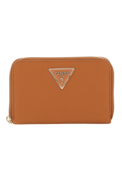 Portofel maro pentru femei de la Guess, realizat din piele ecologică. Cu o închidere cu fermoar, are un buzunar intern pentru monede, două compartimente, patru sloturi pentru carduri și două buzunare.