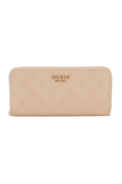 Portofel pentru femei din piele ecologică bej de la Guess. Închidere cu fermoar, buzunar interior cu fermoar pentru monede, două compartimente, 12 sloturi pentru carduri, două buzunare glisante și un buzunar suplimentar cu fermoar în spate.