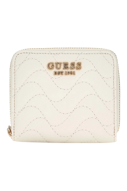 Portofel alb pentru femei de la Guess, realizat din piele ecologică. Închidere cu fermoar, în interior un buzunar pentru monede blocabil, un compartiment și 4 sloturi pentru carduri.