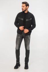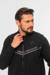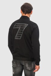 Hanorac EMPORIO ARMANI negru pentru bărbați. Două dungi decorative pe piept: brocart negru și gri. Pe partea stângă a pieptului, aplicație neagră cu logo-ul EA7. Pe spate, o aplicație mare cu un "7" din brocart. Hanorac cu fermoar, cu guler ridicat. Două buzunare cu fermoar. Mâneci cu manșete cu nervuri și elastic lat la tiv.