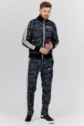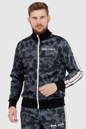 Hanorac bărbătesc descheiat PALM ANGELS negru cu moro gri. Căptușeală bej pe mâneci. Logo alb pe față. Sweatshirt cu închidere cu fermoar alb.Două buzunare cufermoarîn față. tiv și mâneci cu nervuri.