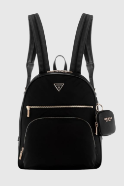 Rucsac Power Play negru pentru femei, de la Guess. Are un compartiment mare cu fermoar și trei buzunare în interior: două buzunare glisante, un buzunar cu fermoar. La exterior există două buzunare cu fermoar. Rucsacul are picioare de protecție și este inclusă o pungă de praf.