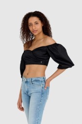 GUESS Bluză scurtă neagră cu mâneci bufante pentru femei