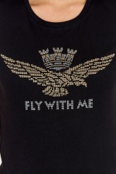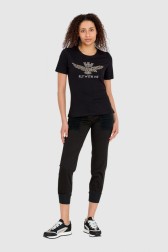 AERONAUTICA MILITARE Tricou negru din bumbac pentru femei cu vultur cu pietre prețioase