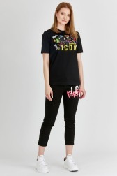 Tricou de damă în negru. Cu imprimeu graffiti colorat și logo galben pe față. Tricoul are un decolteu rotund, cu nervuri.