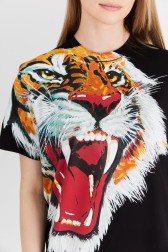 Tricou de damă în negru. Imprimeu tigru mare pe față. Logo galben pe lateral. Tricoul are un decolteu rotund, cu nervuri.