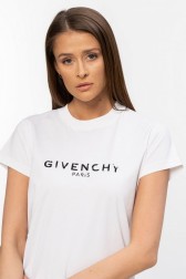 Tricou pentru femei GIVENCHY în alb. Decorat cu un logo negru cu efect vintage. Tricoul are un decolteu rotund cu nervuri.