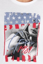 Tricou pentru femei GUESS în alb. Imprimeu mare cu sclipici pe față. Legătură la spate.