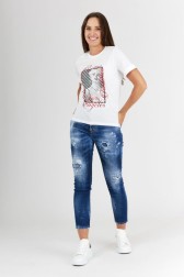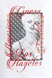Tricou pentru femei GUESS în alb. Imprimeu mare cu model în față. Mâneci răsucite.