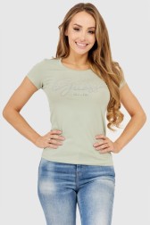Tricou pentru femei GUESS în verde deschis cu logo argintiu și cristale.