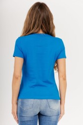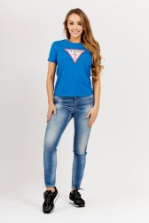 Tricou pentru femei GUESS de culoare albastră. Imprimate pe față cu un logo triunghiular mare.