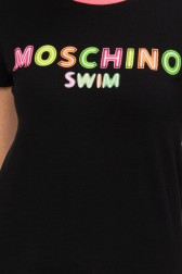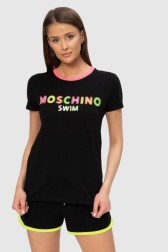 Tricou de damă MOSCHINO SWIM în negru. Decorat cu un logo neon în roz, portocaliu, galben și verde. Decolteu rotund cu nervuri în roz.