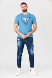 Tricou bărbătesc GUESS în albastru. Dispune de un imprimeu triunghiular mare cu logo din catifea pe față.