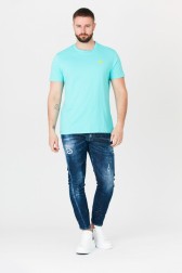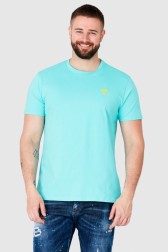 Tricou GUESS pentru bărbați în turcoaz. Logo galben aplicat în față.