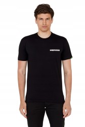 Tricou negru pentru bărbați cu un logo mic și un design brodat pe umăr.