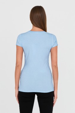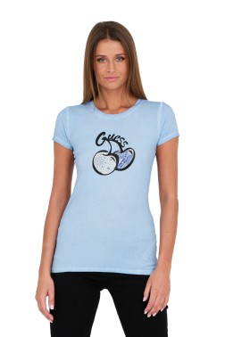 GUESS Tricou albastru din bumbac pentru femei cu imprimeu și zirconii