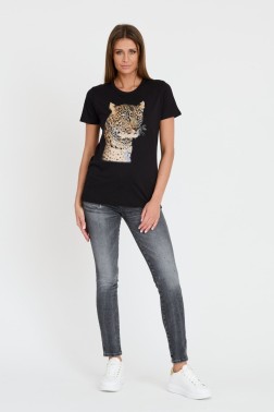 Tricou negru Leopard Jewel Easy Tee pentru femei, de la Guess.
