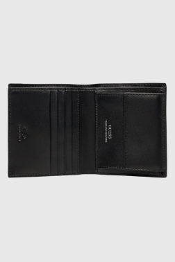 Чорний чоловічий гаманець з натуральної шкіри від Guess. Має кишеню для монет на застібці, п'ять відділень для карток та кишеню для карток.