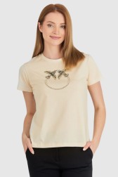 Жіноча футболка PINKO бежевого кольору. Спереду логотип з блискітками LOVE BIRDS. Круглий ребристий виріз.