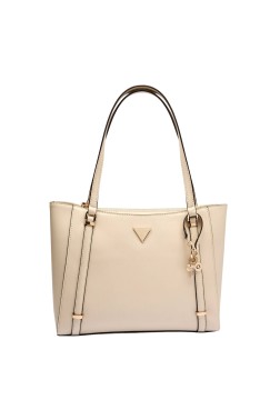 Бежева жіноча сумка Daryna від Guess, виготовлена з екологічно чистої шкіри, має три відділення, два на блискавці і одне на магнітах, з трьома кишенями всередині: дві врізні, одна на блискавці і одна кишеня зовні. Сумка оснащена захисними ніжками та мішечком для пилу.