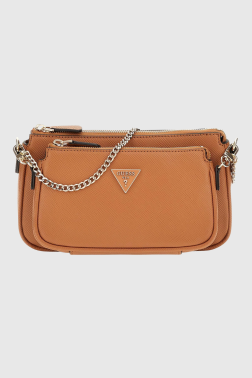 Коричнева жіноча сумка Noelle від Guess, виготовлена з екологічно чистої шкіри. Вона має регульований ремінець, одне велике відділення з трьома кишенями для карток і однією кишенею на блискавці, а також зовнішню кишеню на блискавці. До неї додається знімний мішечок розміром 11 × 19,5 × 3 см, який можна використовувати як невелику сумочку.