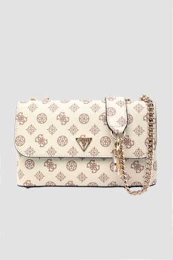 Бежева жіноча сумочка Guess, виготовлена з екологічно чистої шкіри. Має нерегульований ремінець, одне велике відділення з трьома кишенями та кишенею на блискавці, а також додаткове зовнішнє відділення на магнітній застібці. Оснащена захисними ніжками та мішечком для пилу.