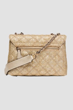 Золотиста жіноча сумочка від Guess. Має два відділення, що закриваються на магнітний клапан, і внутрішню кишеню на блискавці. Додатково оснащена зовнішньою кишенею на блискавці.