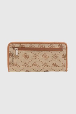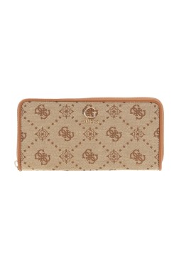 Бежевий жіночий тканинний гаманець від Guess. Застібається на блискавку, має кишеню для монет, два відділення, 12 слотів для карток, дві кишеньки і додаткову зовнішню кишеню на блискавці.