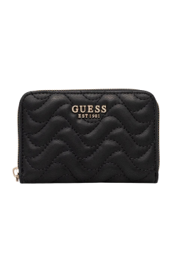 Чорний жіночий гаманець від Guess, виготовлений з екологічно чистої шкіри. Застібається на блискавку, має внутрішню кишеню для монет, два відділення, чотири слоти для карток та дві кишені для карток.