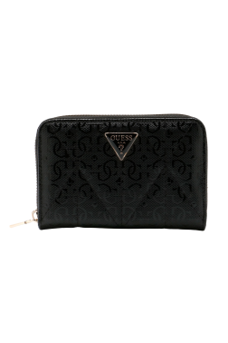Чорний жіночий гаманець від Guess, виготовлений з екологічно чистої шкіри. Застібається на блискавку, має внутрішню кишеню для монет, два відділення, чотири слоти для карток і дві кишені для карток.